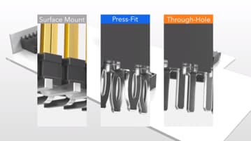 • Durchsteckmontage: Bei dieser klassischen Methode werden die Pins des Anschlusses durch die beschichteten Bohrungen des Boards gesteckt und dort verlötet. Bei der Fertigung können Hand- oder Schwall-Löten oder sogar ein Lötroboter zum Einsatz kommen. In einigen Fällen wird eine „Pin-in-Paste“-Technik verwendet, um den Anschluss während des Reflow-Prozesses zusammen mit den Bauteilen für die Oberflächenmontage zu löten.