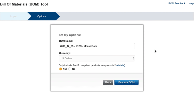 - Ja – Filtert BOM-Übereinstimmungen, um ausschließlich RoHs-konforme Produkte anzuzeigen.