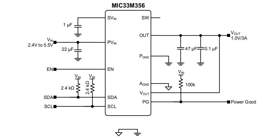 Die MIC33M356 I2C-Schnittstelle ermöglicht die Programmierung der Ausgangsspannung zwischen 0,6 V und 1,28 V mit einer 5-mV-Auflösung (-HAYMP und -FAYMP) oder zwischen 0,6 V und 3,84 V mit einer 10-mV- und 20-mV-Auflösung (-SAYMP). Zwei verschiedene Standardspannungsoptionen (0,9 V und 1,0 V) werden bereitgestellt, so dass die Applikation mit einem sicheren Spannungspegel gestartet und anschließend im Hochleistungsmodi unter der I2C-Steuerung umgeschaltet werden kann.