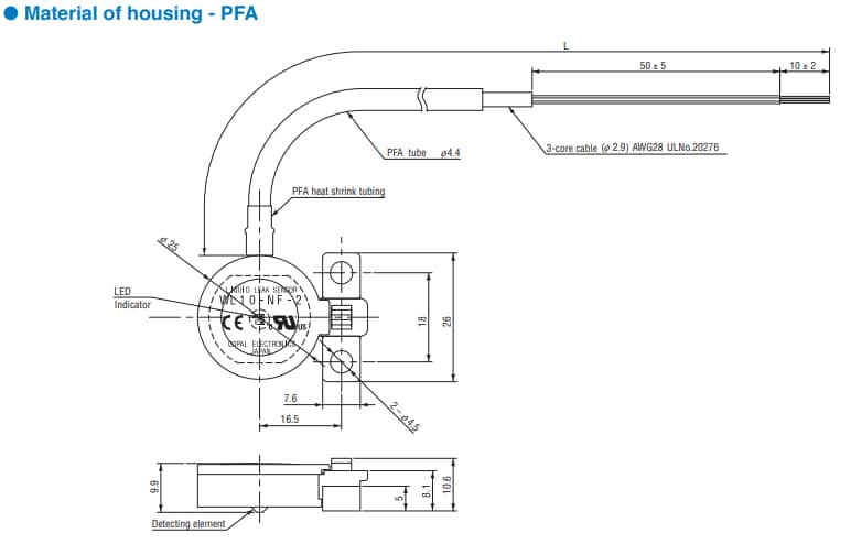 Nidec Components WL10 Liquid Leak Sensors can detect leakage without a douser and additional amplifying circuit. The WL10 sensors include an LED and a partial discharge (PD) detector inside. The light emitted from the LED is reflected by the prism, received by the PD, and converted to current. Nidec WL10 Liquid Leak Sensors feature PFA casing available for detecting leakage of corrosive liquid and are operable in various areas by unique optical technology. This optical technology does not require a douser and detects liquid leakage with high precision and quickness. The liquid leak sensors operate from 12VDC to 24VDC supply voltage range and -10°C to +60°C temperature range. Typical applications include semiconductor production lines, industrial equipment, pneumatic equipment, medical devices, analyzers, and data centers.Features