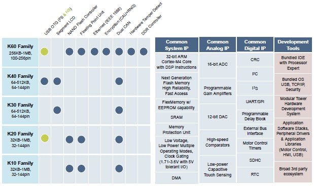 All Kinetis families include a powerful array of analog, communication and timing and control peripherals with the level of feature integration increasing with flash memory size and the number of inputs/outputs.